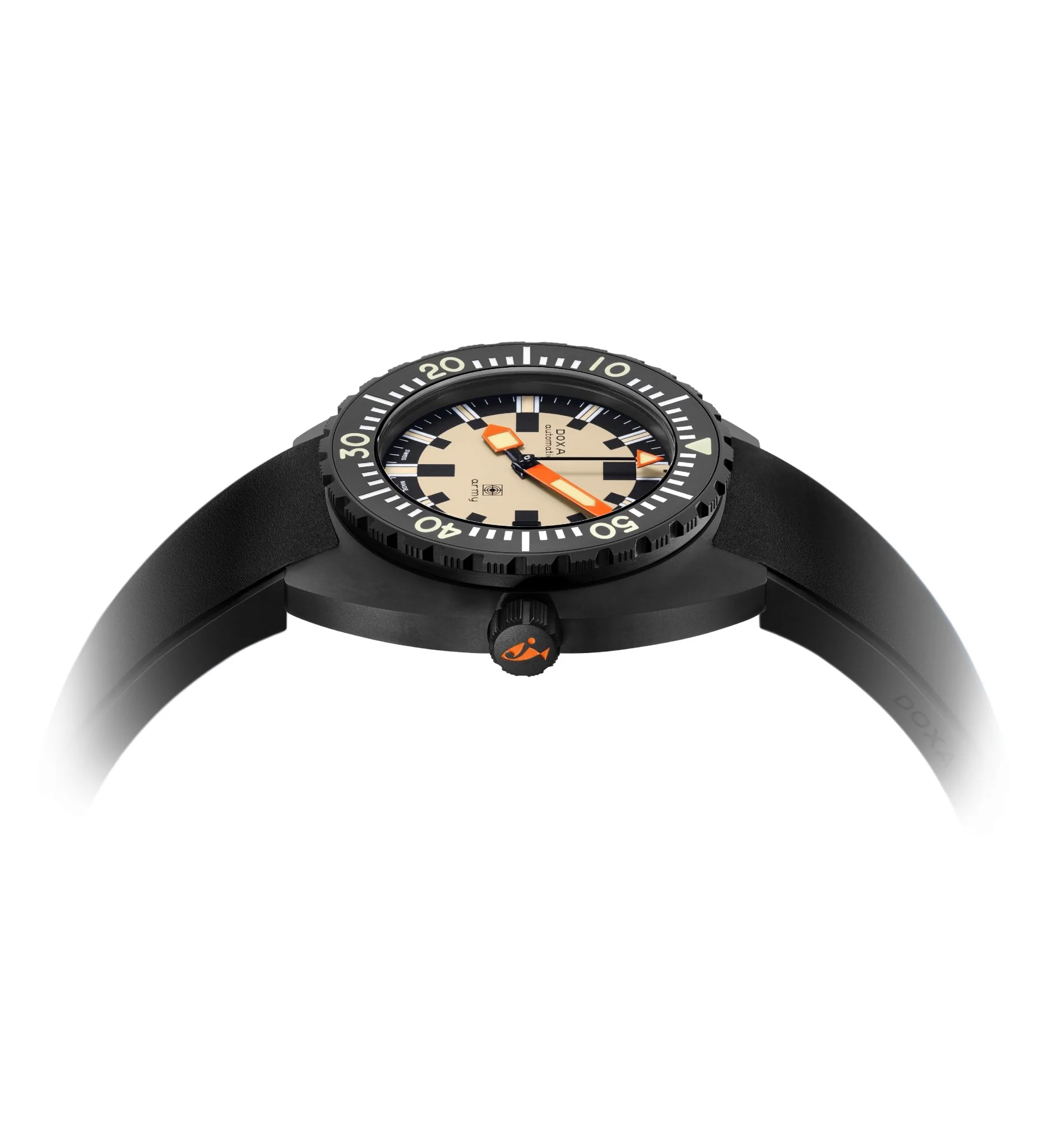 The DOXA Army occupies a special place in the brand’s history not only because of its connection with the Swiss Army. It was also one of the very first watches to use a coating process for cases that was relatively new to the watchmaking industry: the stainless-steel case was blackened by oxidation, giving it a matte black finish that prevented any glare, a key criterion for military equipment. This visual effect, quite original at the time, is maintained in today's reissue through the choice of matte black ceramic for the case.