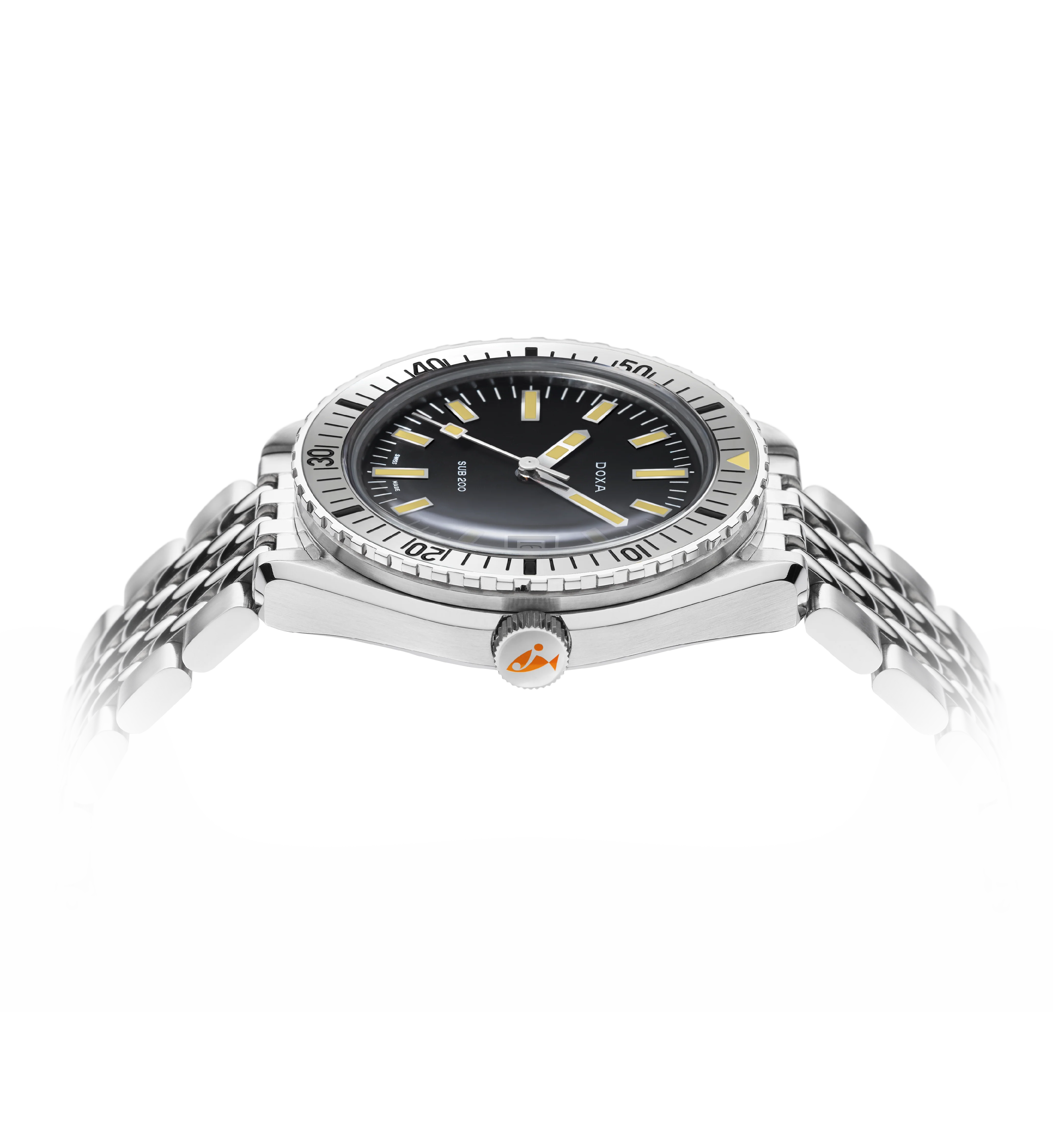 Unveiled at Baselworld 2019, this 3-hand diver's watch has a case made of highest-quality 316L stainless steel. At a diameter of 42 mm, the SUB 200 is topped by a scratch-resistant sapphire crystal with an anti-reflective coating and the distinctive curvature of the domed plexiglass used back in the day. Waterproof to a depth of 200 meters (20 ATM), the model features a unidirectional rotating bezel. All the elements providing dive-relevant information, including the bezel, have a SuperāLumiNovaĀ® luminescent coating. The bracelet is 316L stainless steel and features a folding clasp with the DOXA fish symbol.
