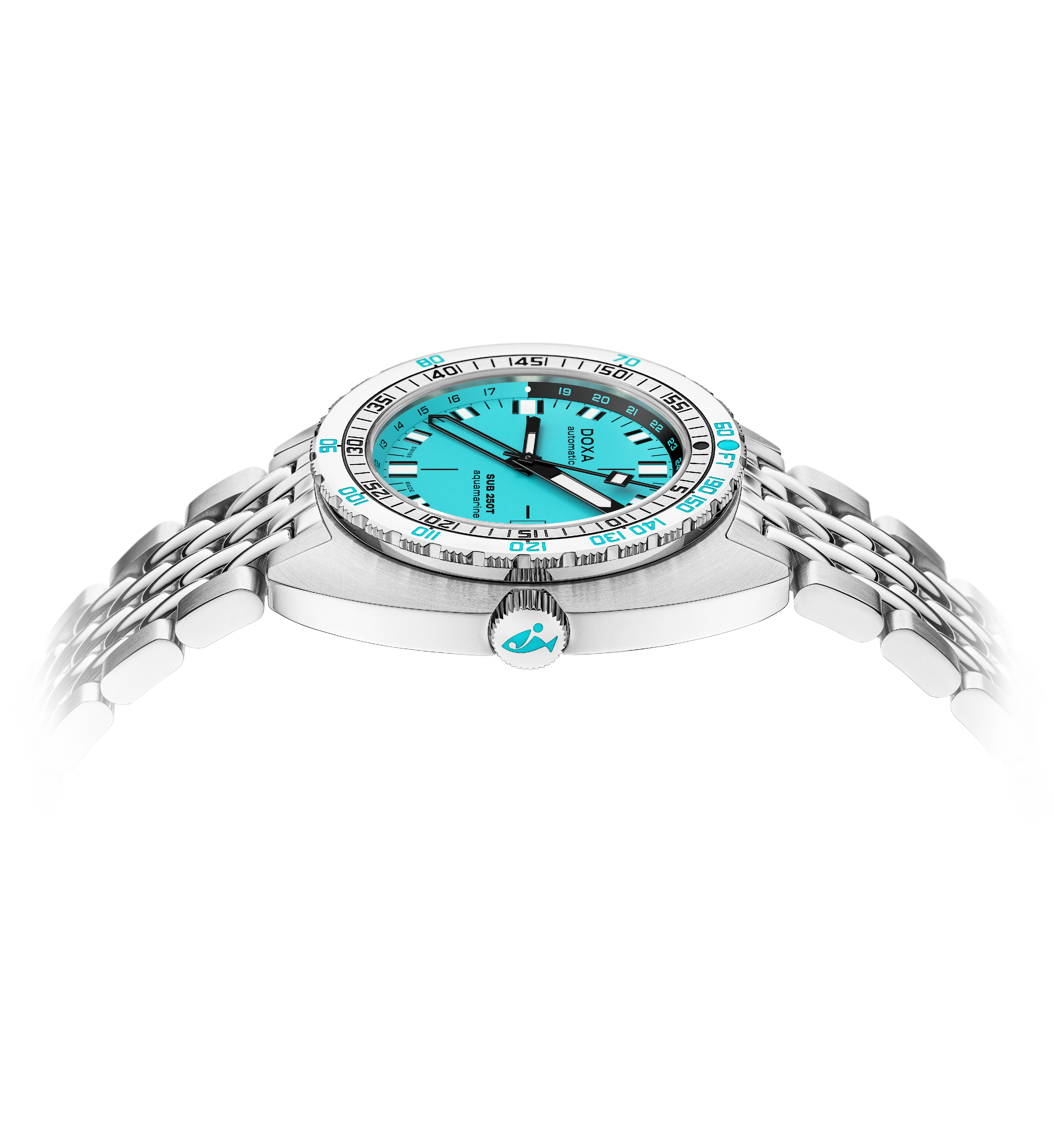 The SUB 250T GMT marks DOXA’s return to the GMT function, blending dive-watch durability with world-time functionality. Its 40mm stainless steel case ensures a perfect balance of wrist presence and comfort, while the screw-down crown and unidirectional bezel with diving scales provide professional-grade performance. With a water resistance of 250 meters (820 feet), it’s built for both underwater exploration and global travel.