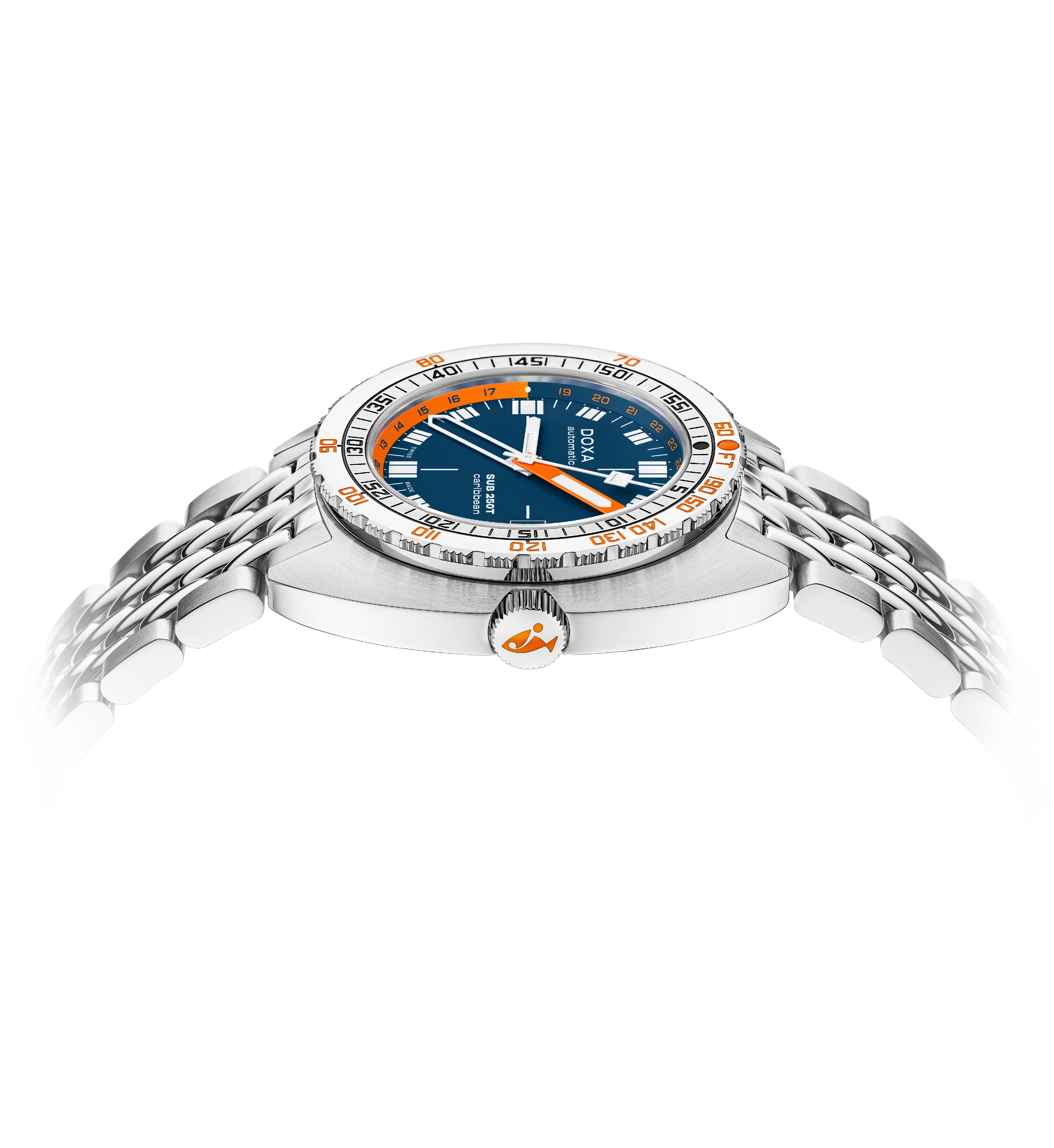 The SUB 250T GMT marks DOXA’s return to the GMT function, blending dive-watch durability with world-time functionality. Its 40mm stainless steel case ensures a perfect balance of wrist presence and comfort, while the screw-down crown and unidirectional bezel with diving scales provide professional-grade performance. With a water resistance of 250 meters (820 feet), it’s built for both underwater exploration and global travel.