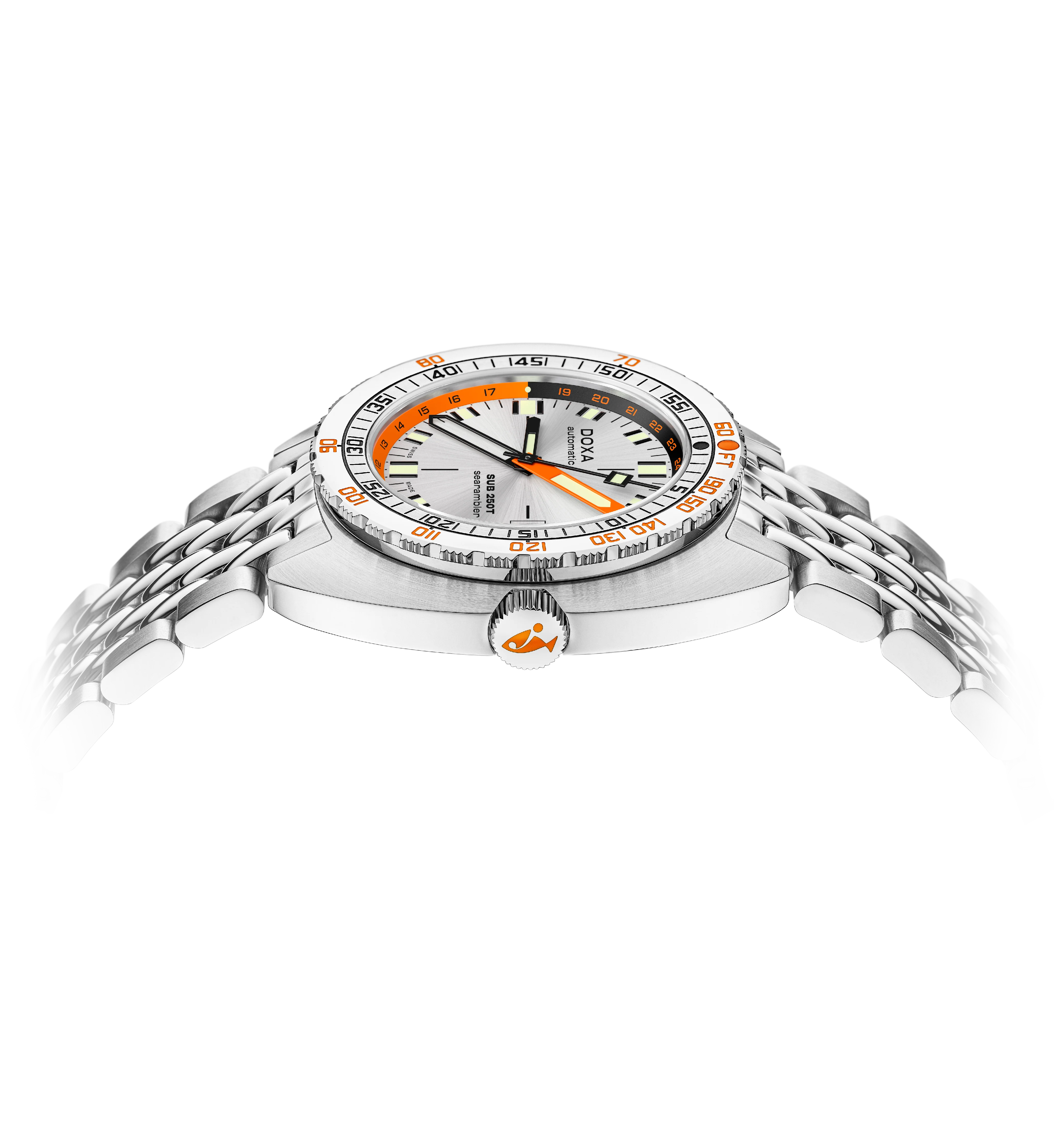 The SUB 250T GMT marks DOXA’s return to the GMT function, blending dive-watch durability with world-time functionality. Its 40mm stainless steel case ensures a perfect balance of wrist presence and comfort, while the screw-down crown and unidirectional bezel with diving scales provide professional-grade performance. With a water resistance of 250 meters (820 feet), it’s built for both underwater exploration and global travel.